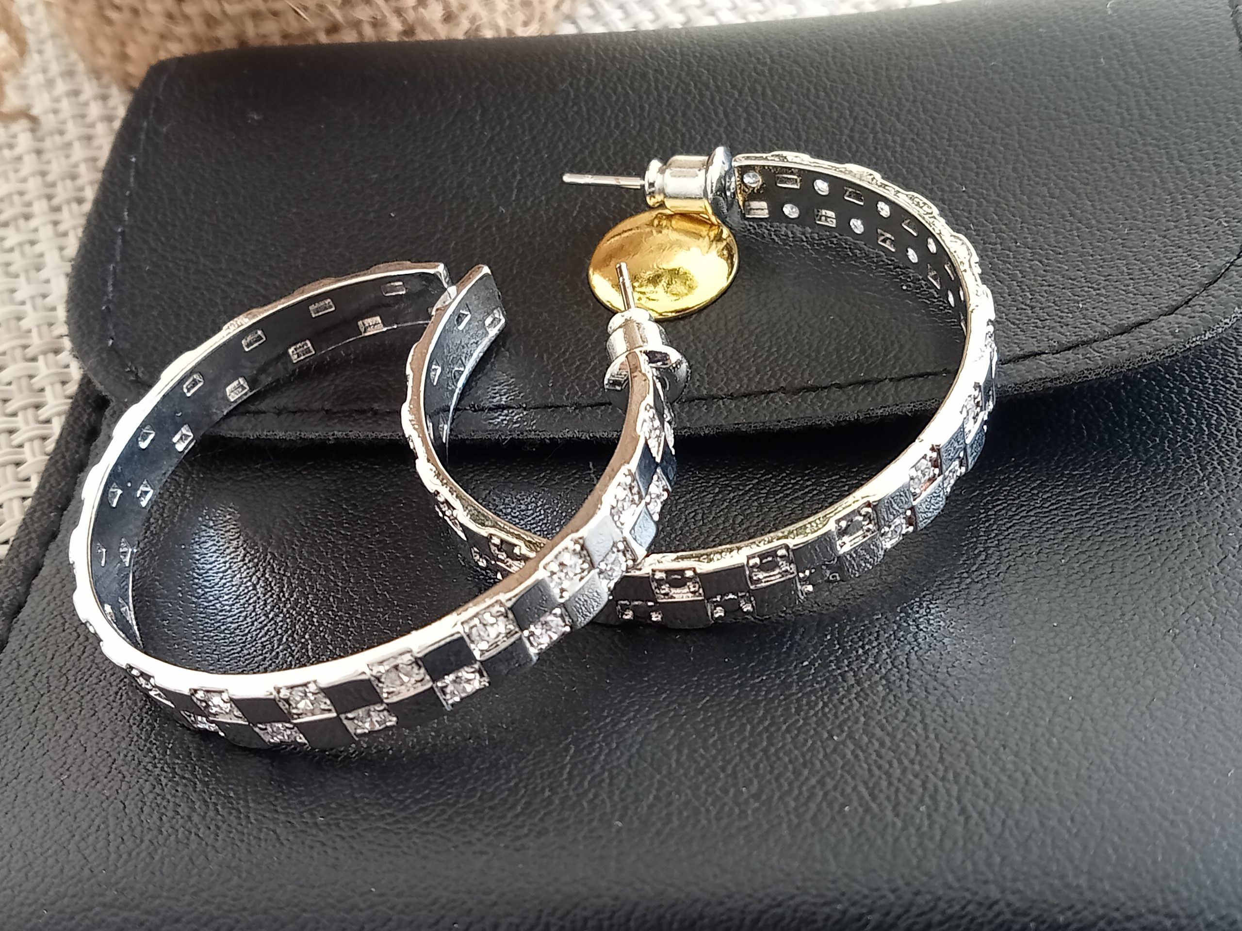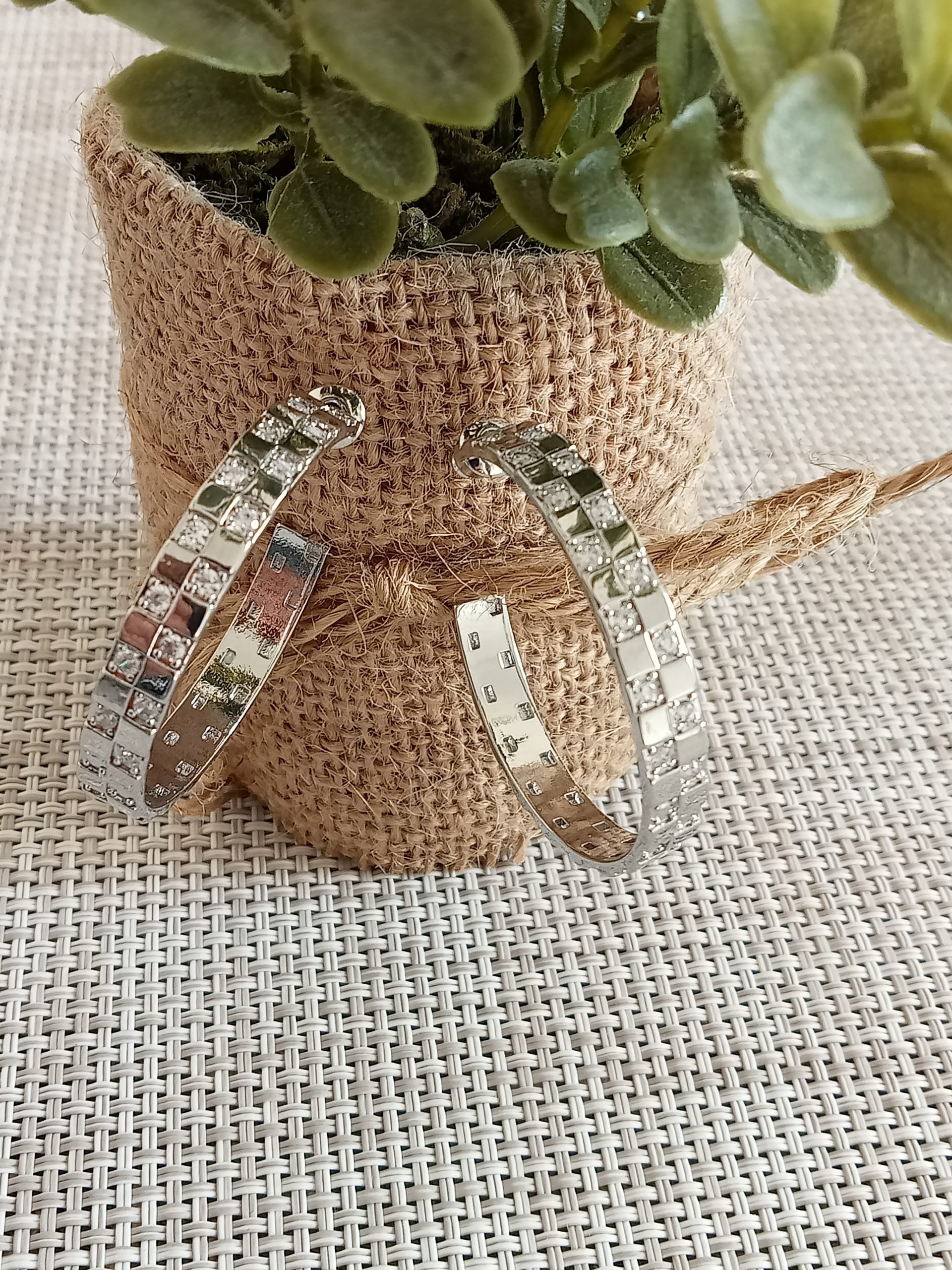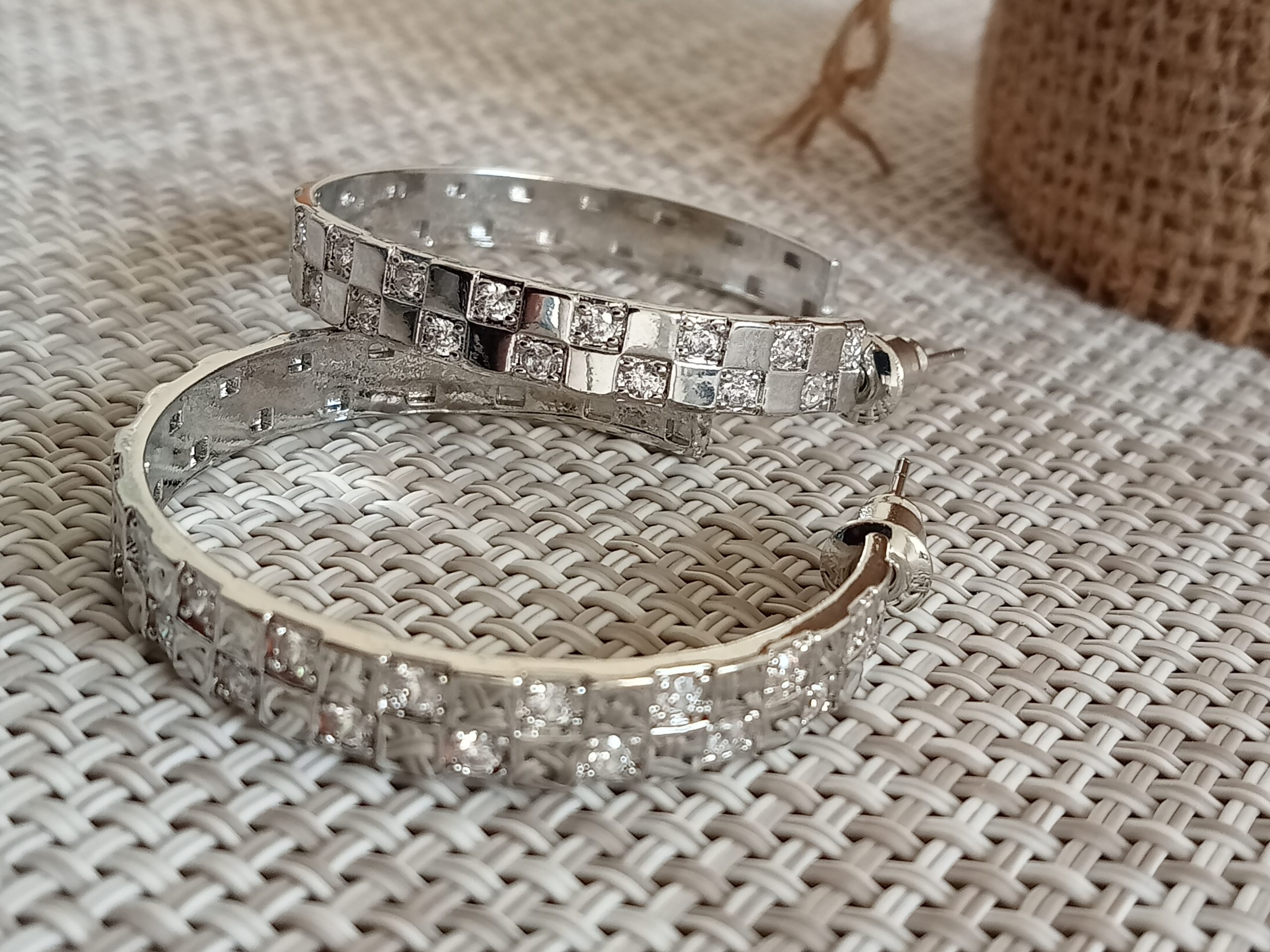 Elegante Aros plateados de diseño de lujo . Decoración con cuadritos y circonitas.