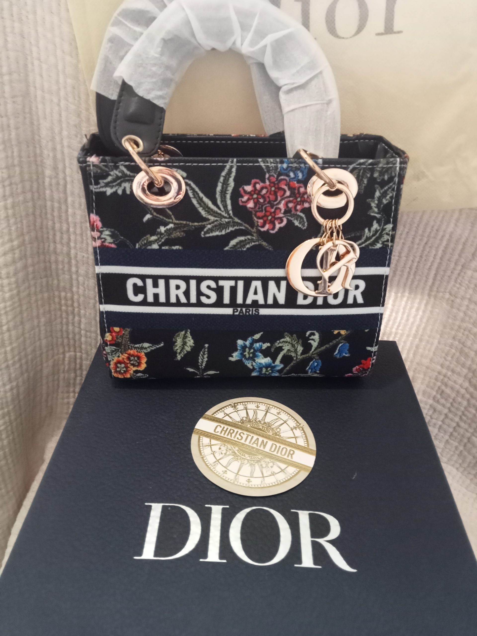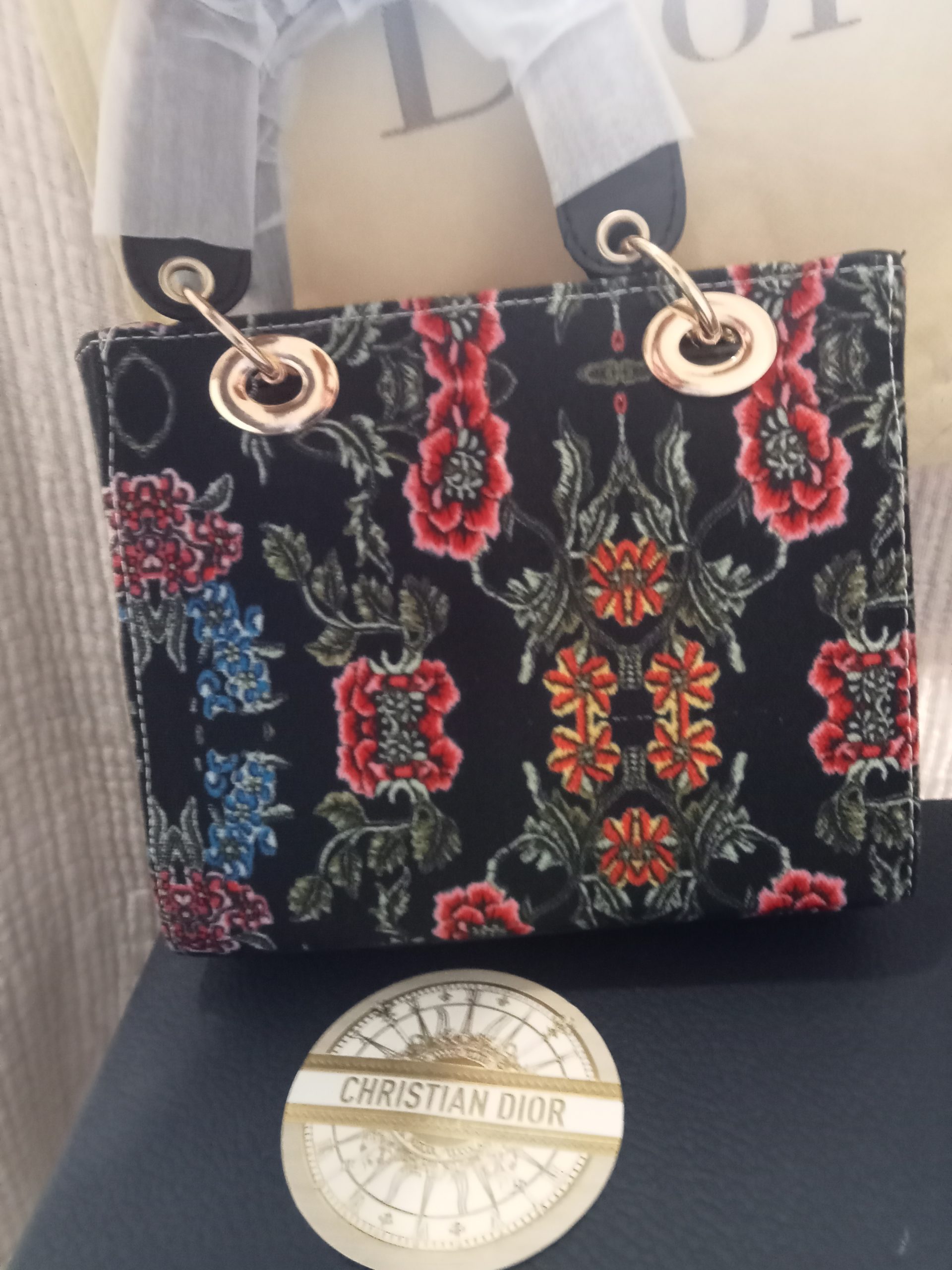 Bolso Christian Di@r estilo Mini Book Tote con diseño floral multicolor predomina el fondo oscuro y las flores rojas .