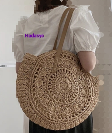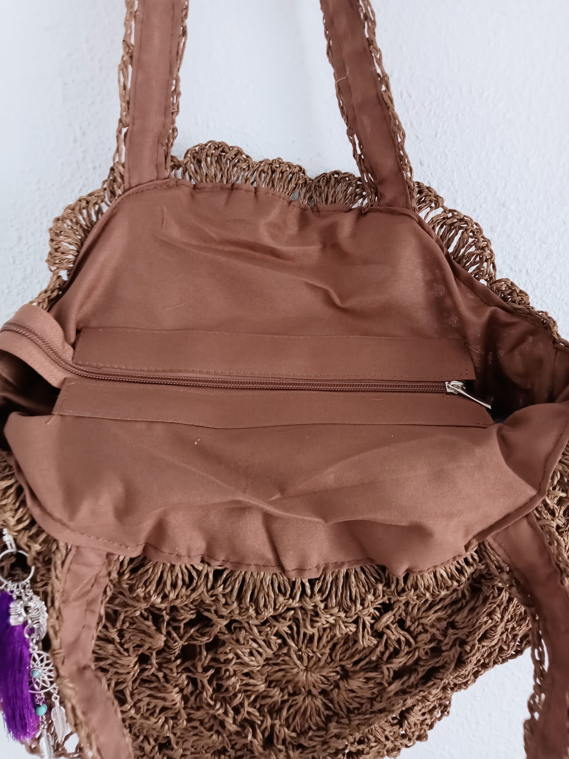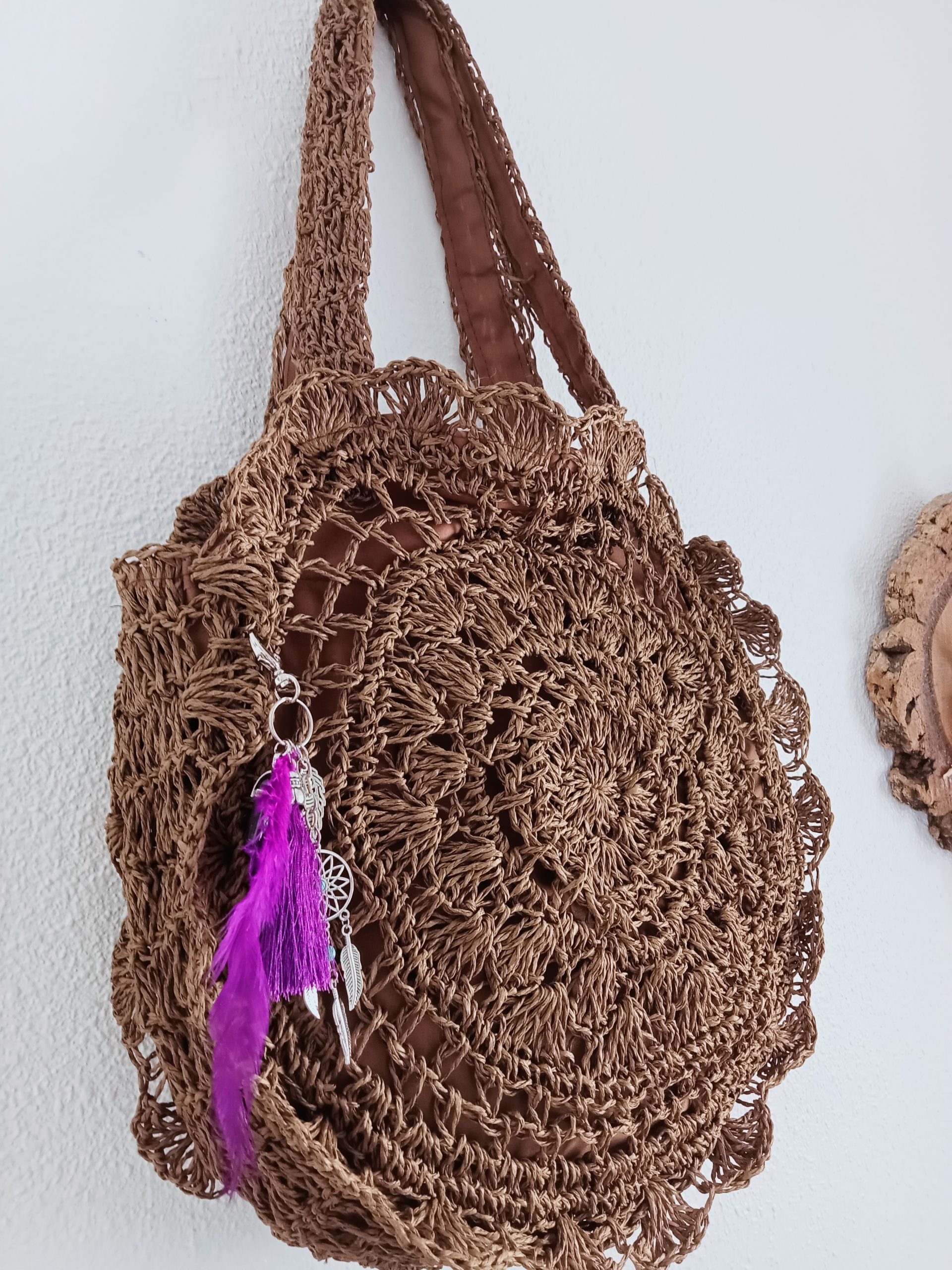 Bonito bolso rafia calado en marrón con abalorios colgando y pluma 🪶.