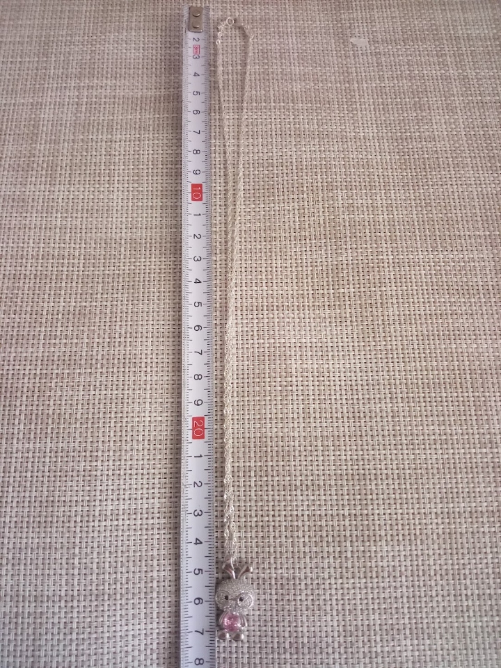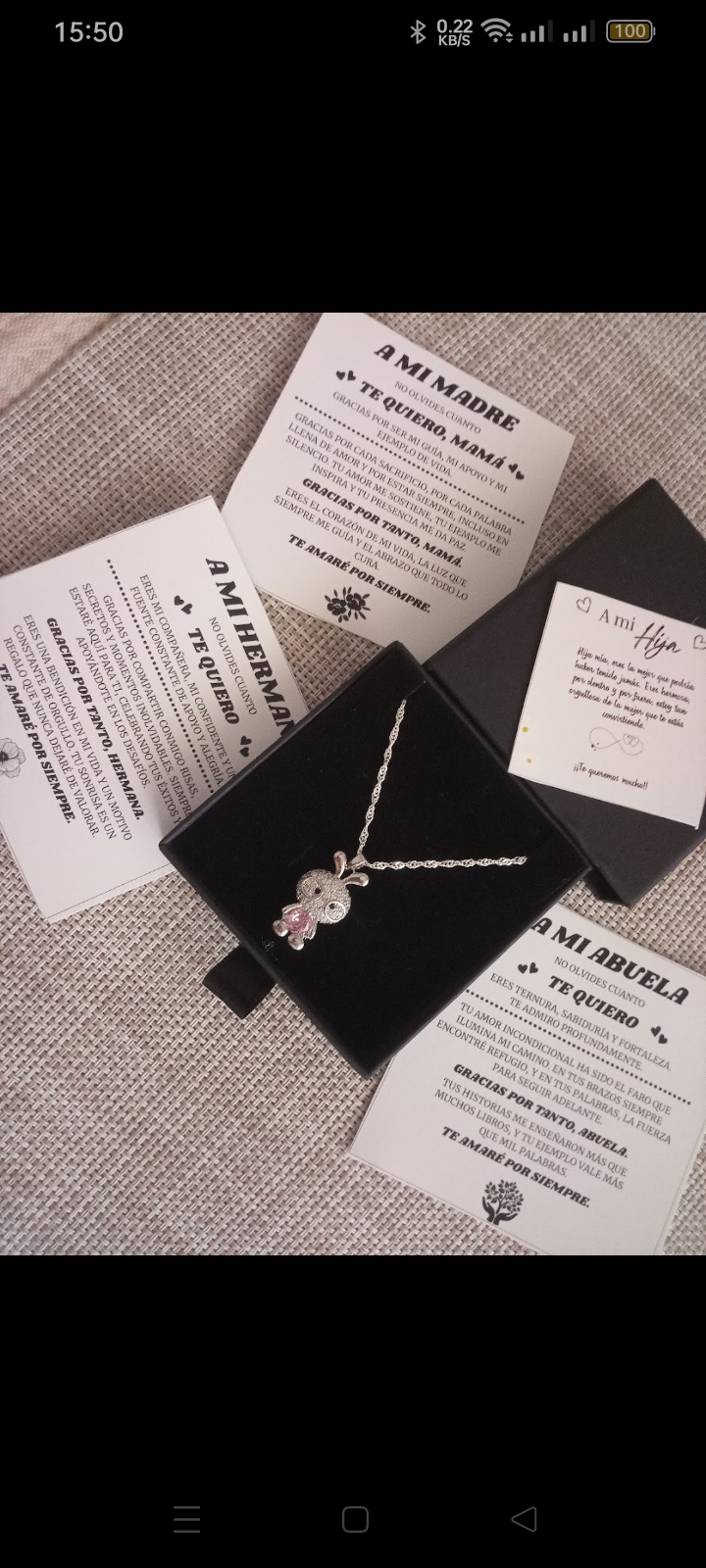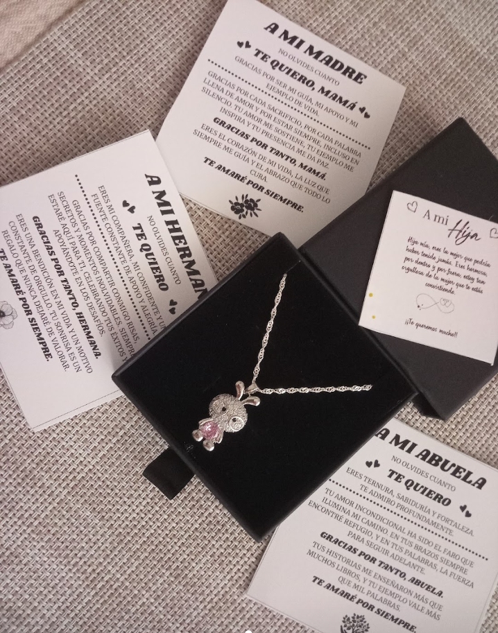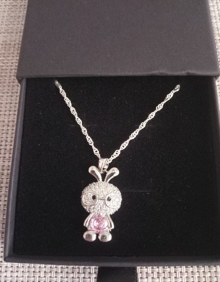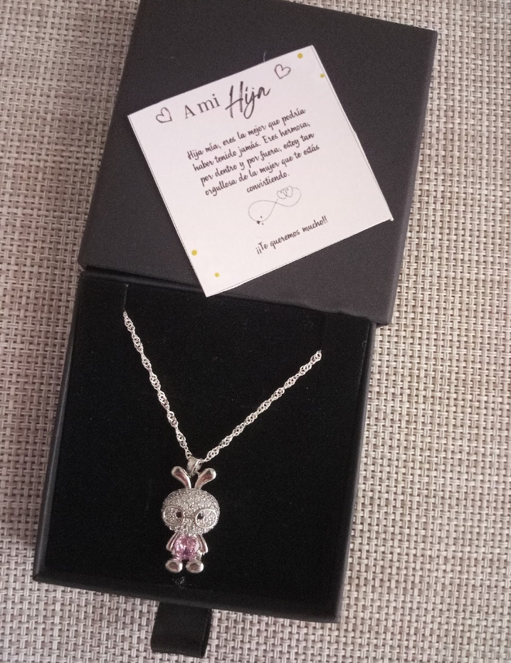 Collar con dije en forma de personaje tierno conejito , elaborado en tono plateado con incrustaciones brillantes.