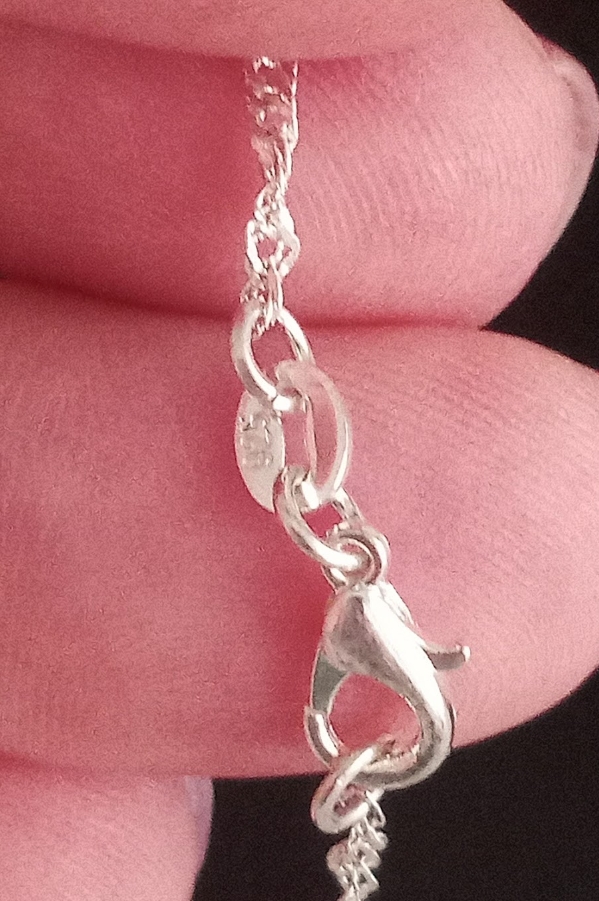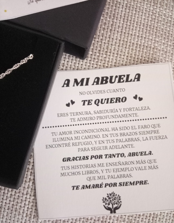 La cadena es fina de plata 925 con eslabones entrelazados, presentada en estuche negro de lujo, ideal para regalo.