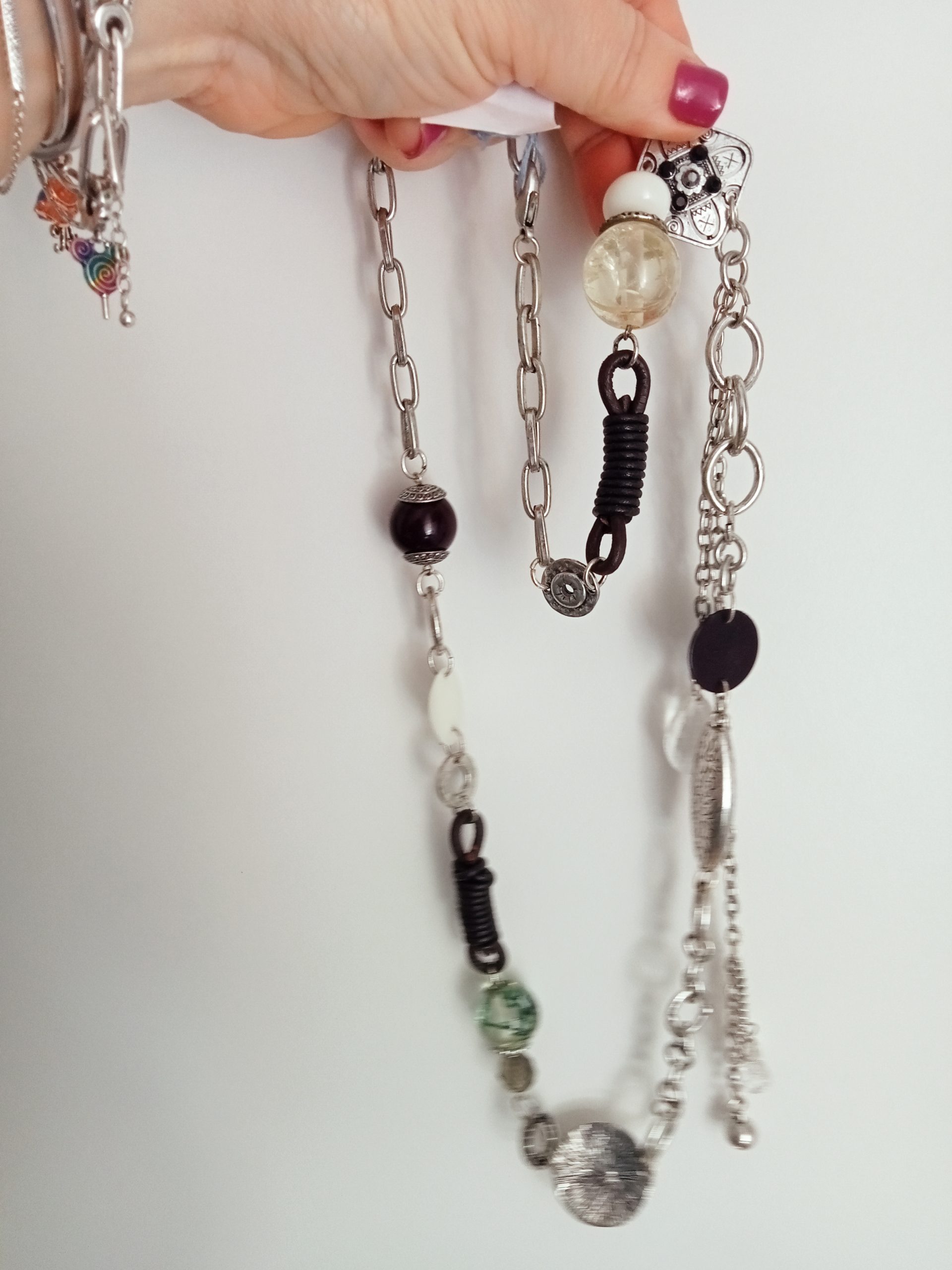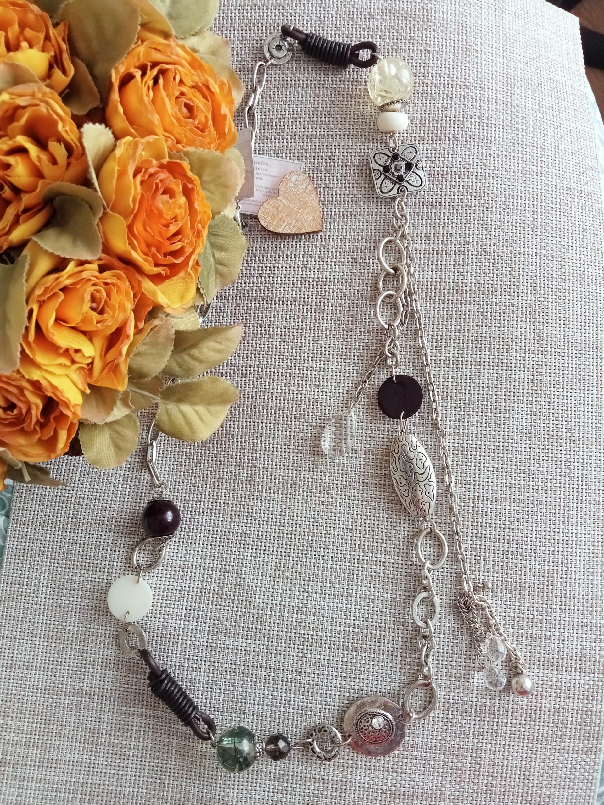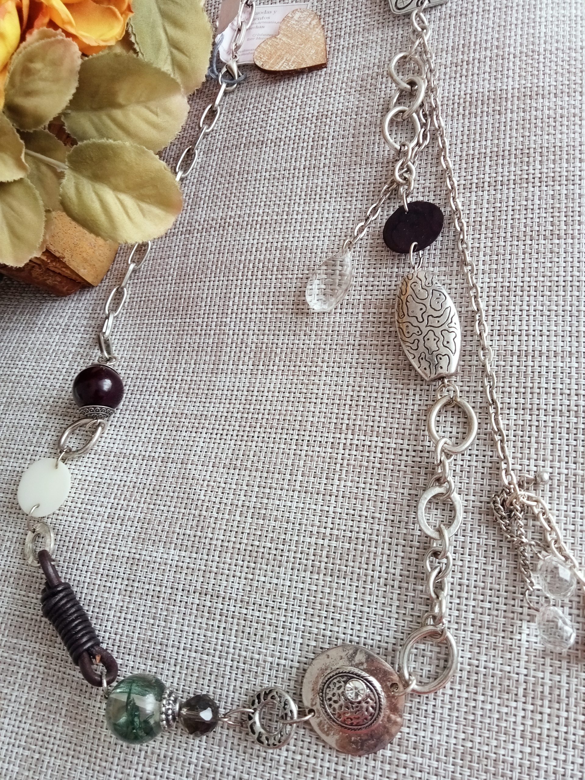 Precioso collar largo de cadenas y abalorios mezclado con cuerdas ,cuentas y cristal. En acero inoxidable.