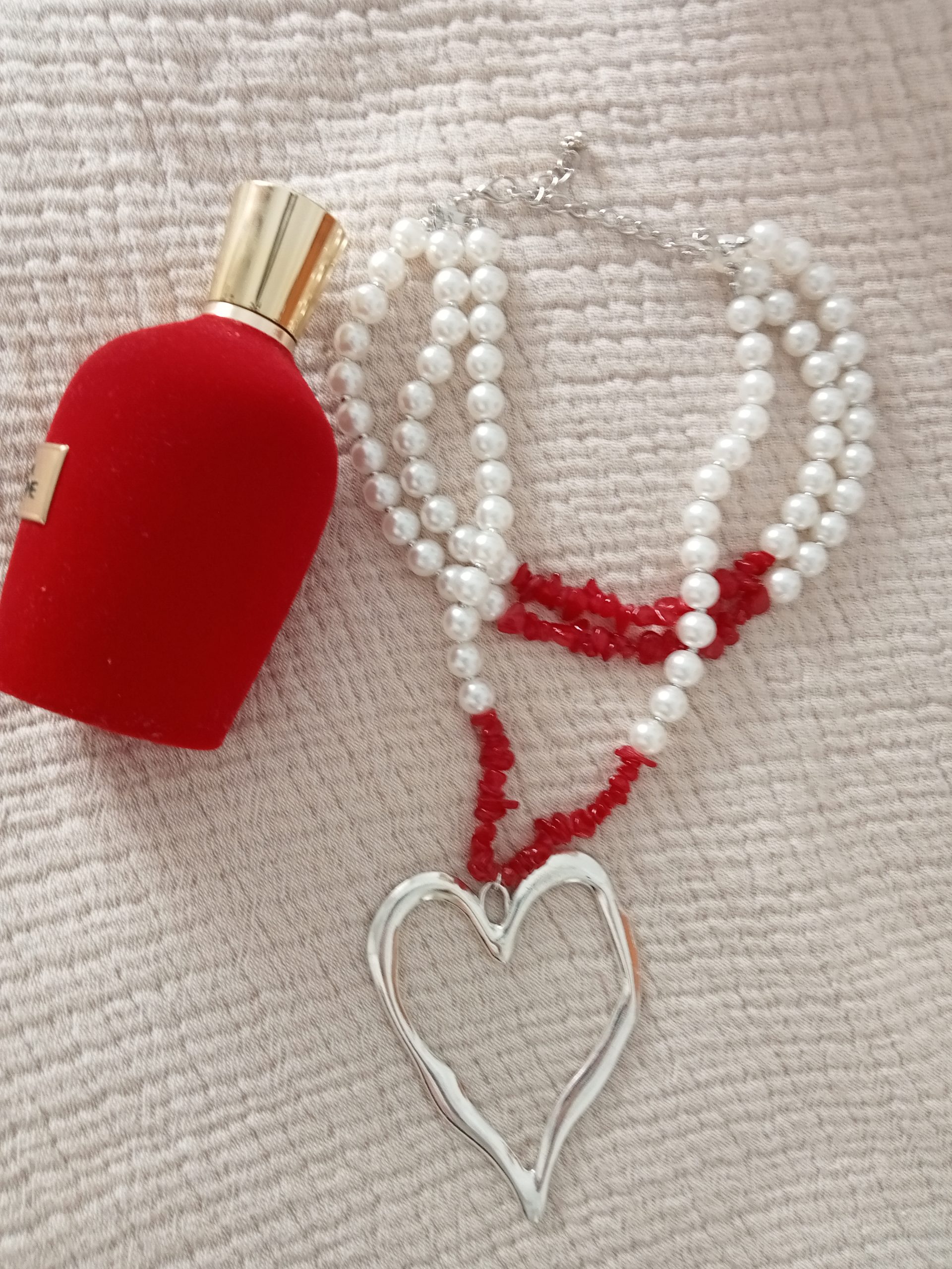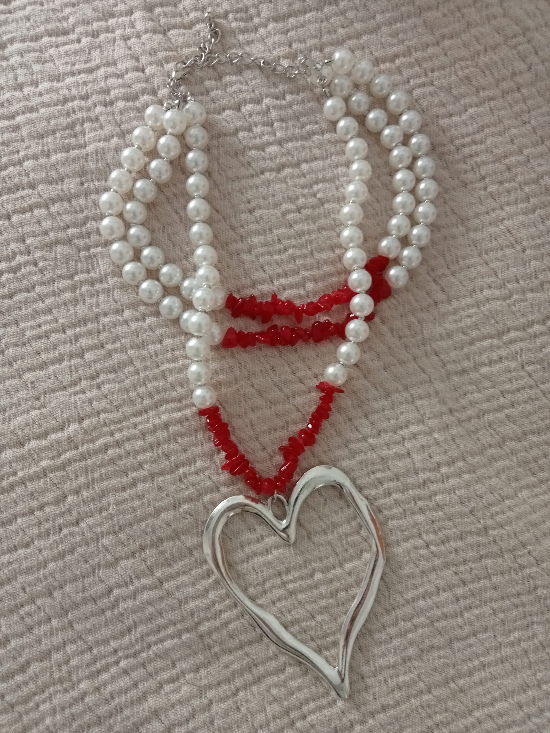 Bonito collar doble en perlas blancas y piedras en rojo con un corazón central plateado.