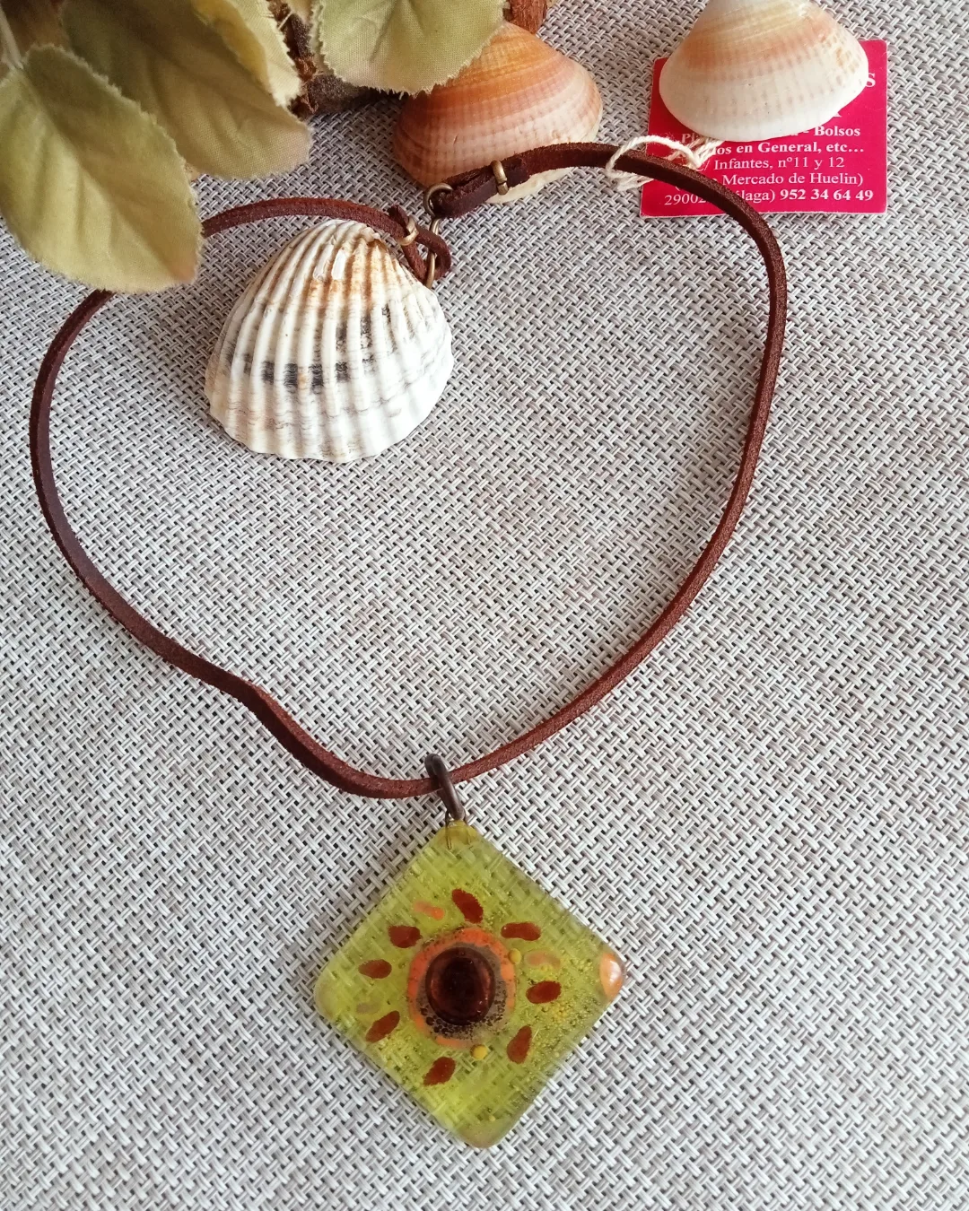 Colgante Hecho a mano en cristal Reciclado ♻️ con decoración y cordón de cuero. 🎁