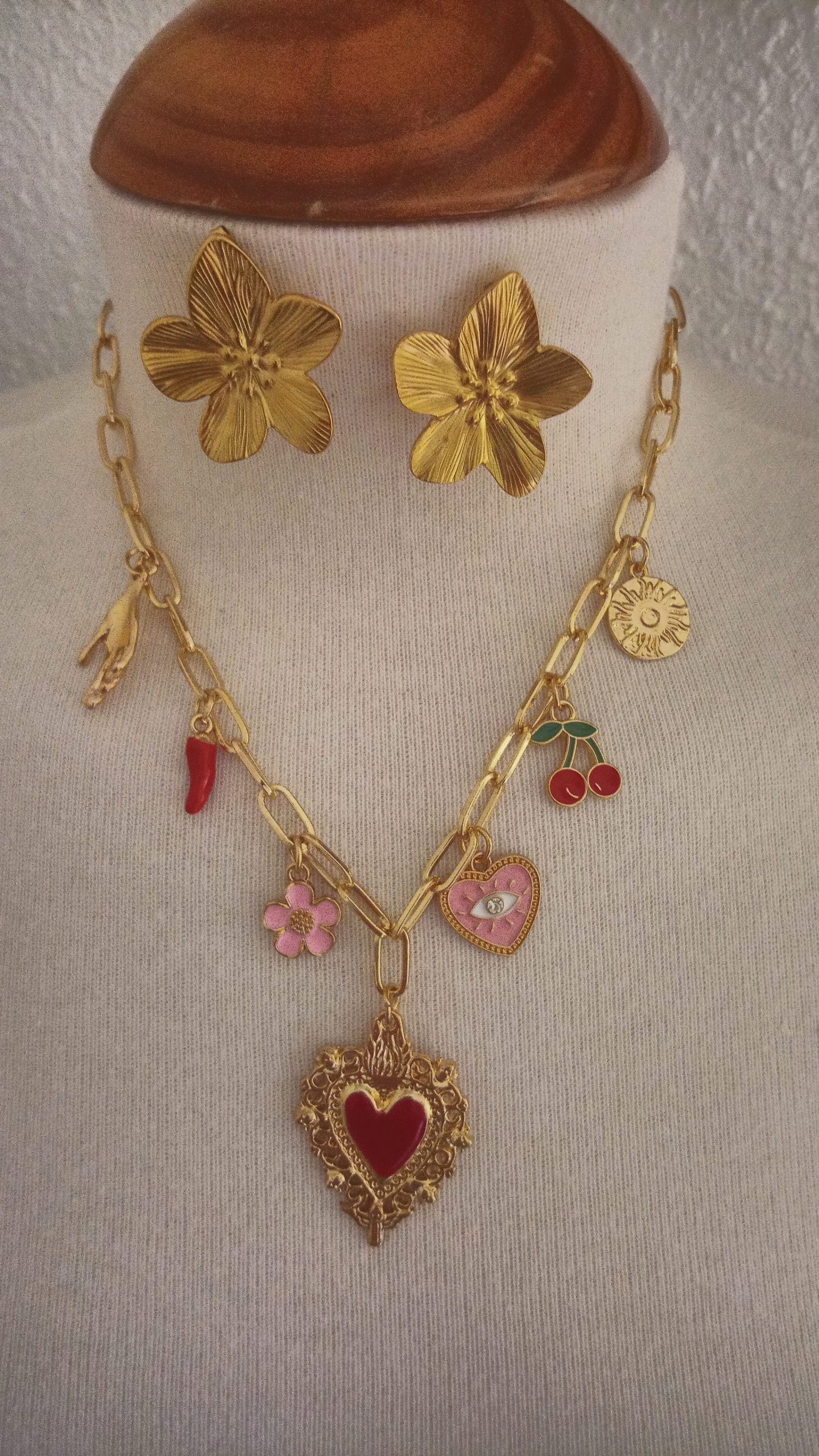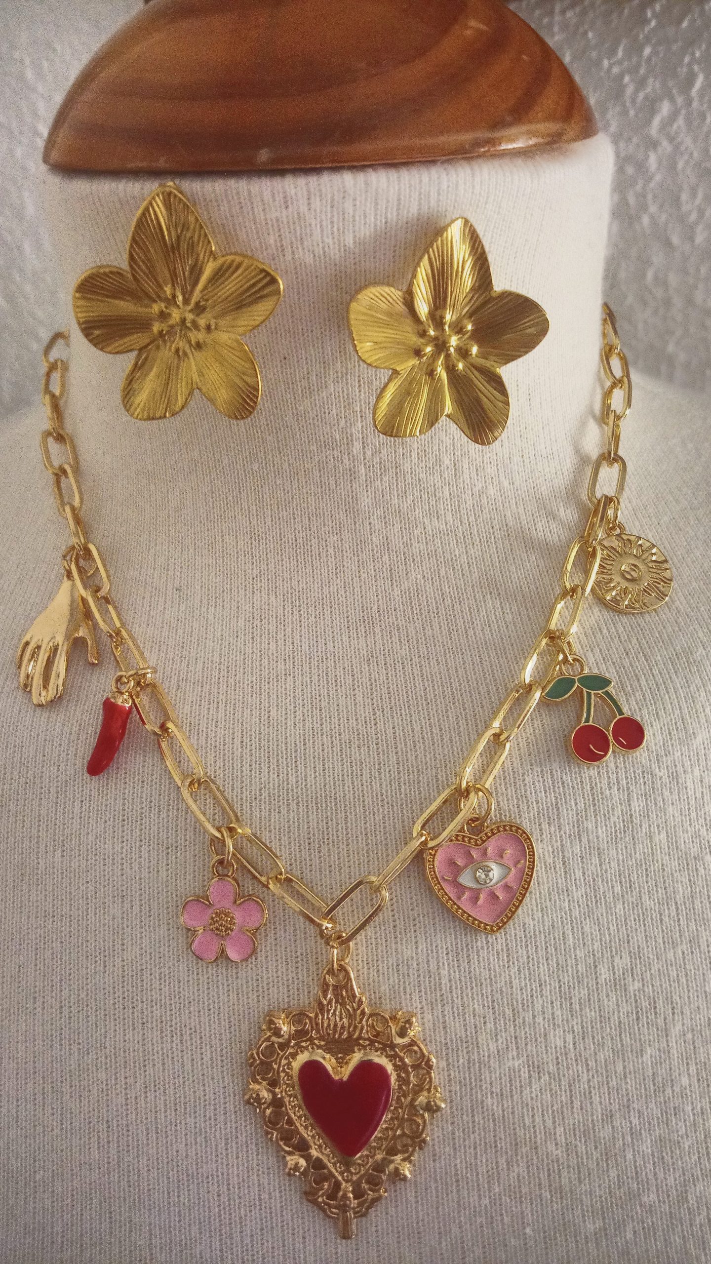 Elegancia con un Toque Místico: Set de Pendientes Flor y Collar Charm Maximalista