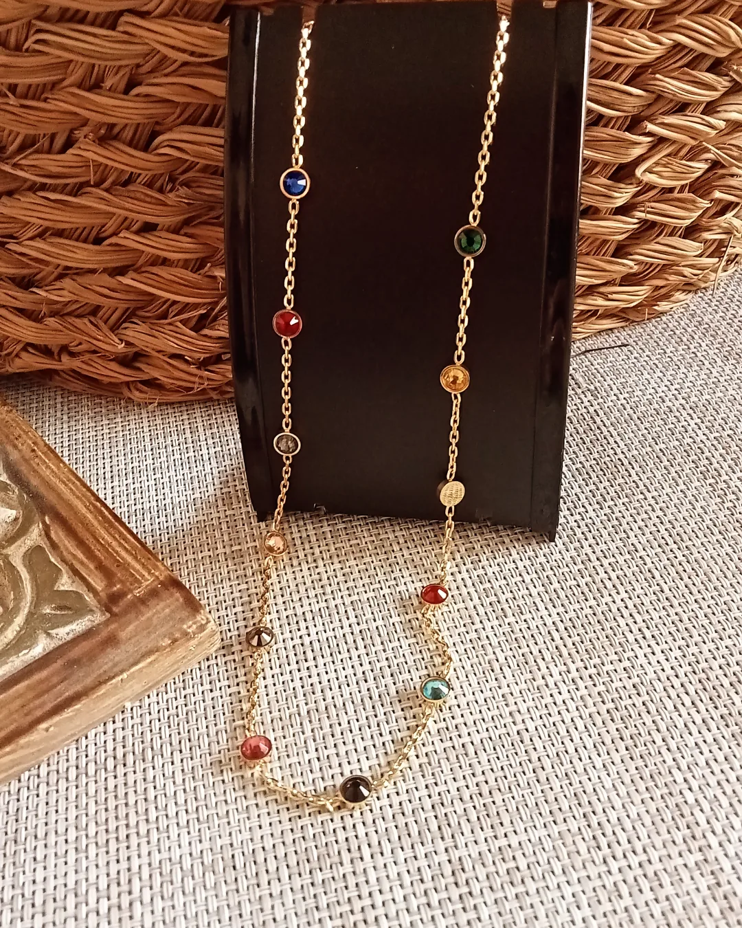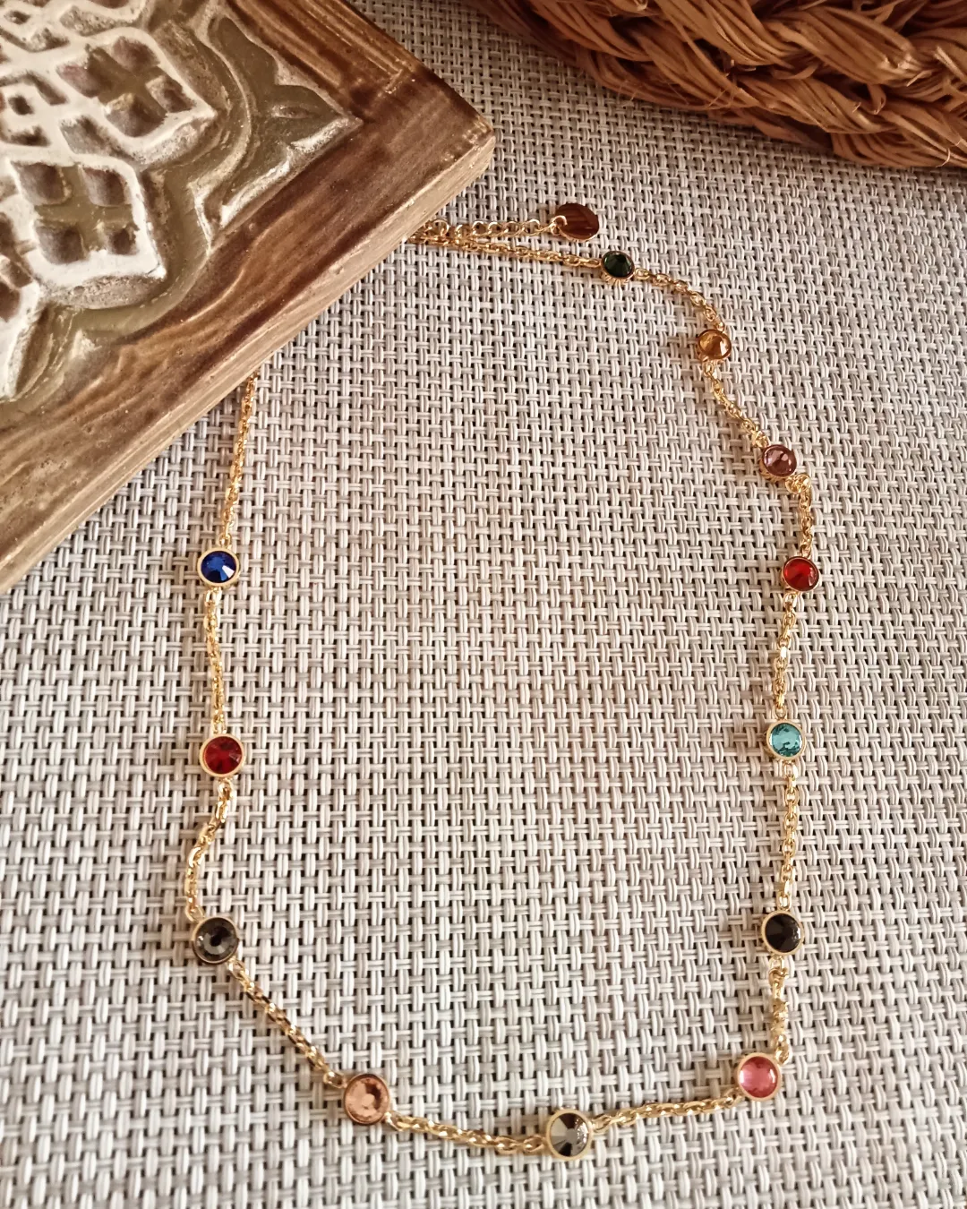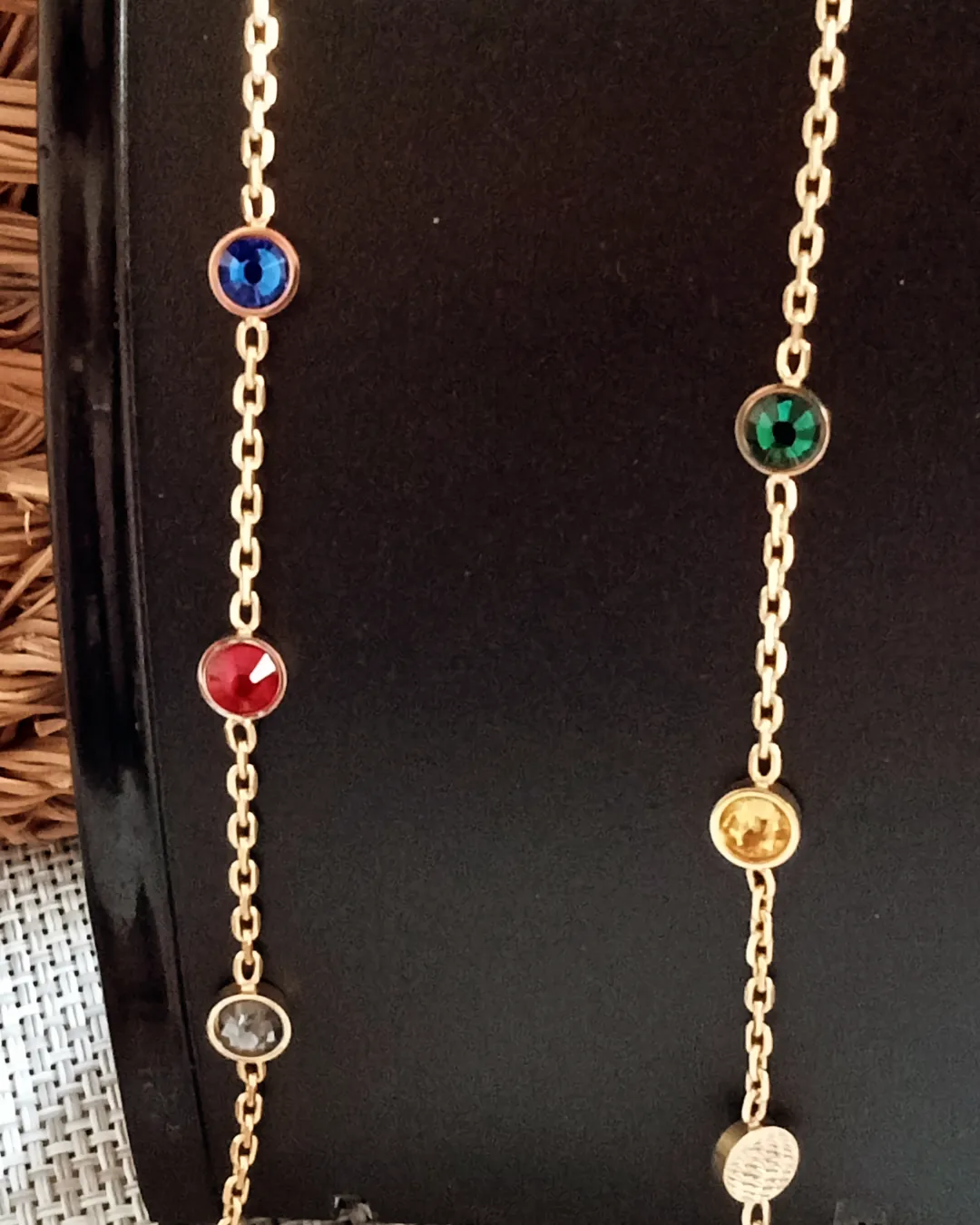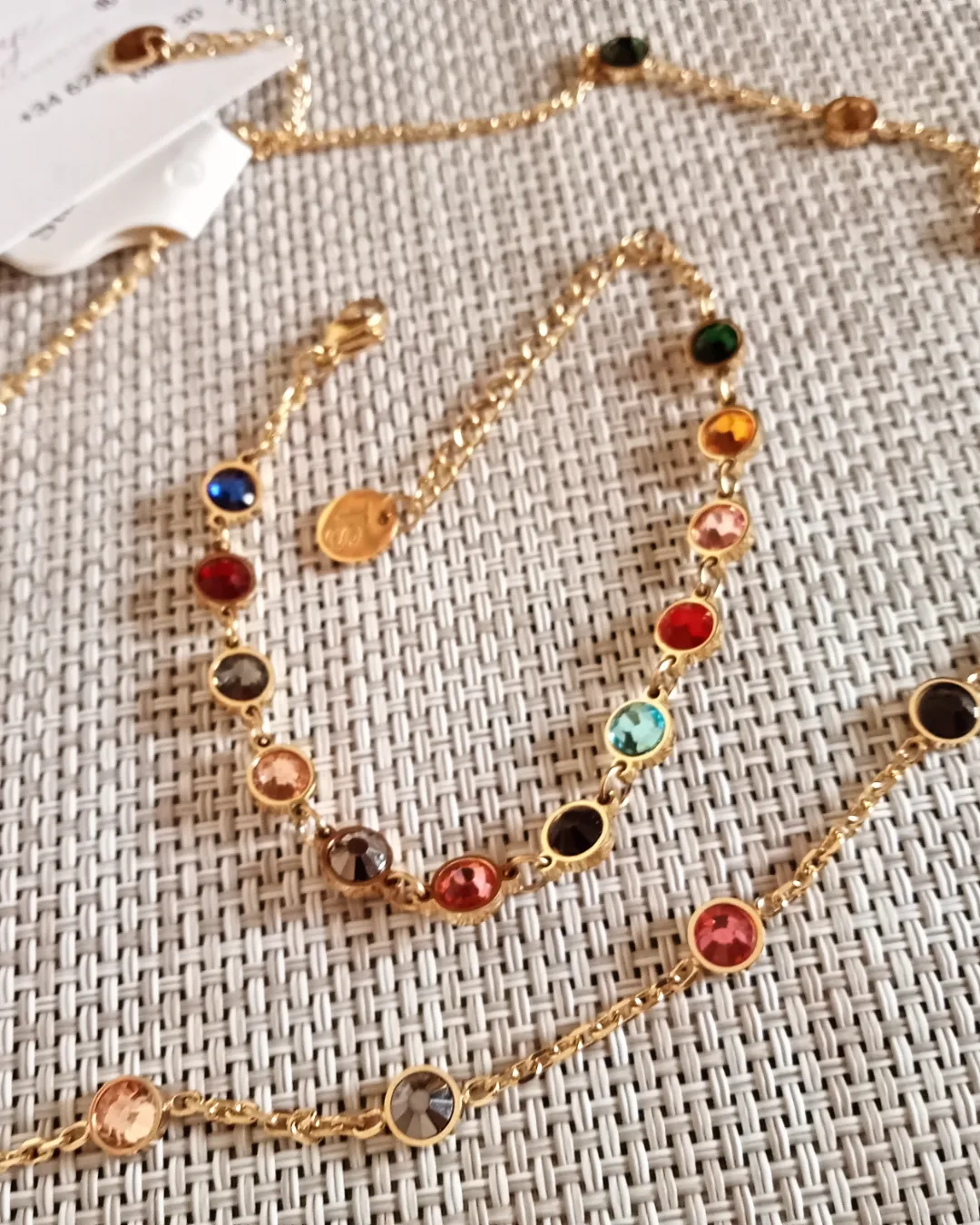Sé el primero en valorar “Conjunto en dorado de pulsera y cadena con cristales de colores”