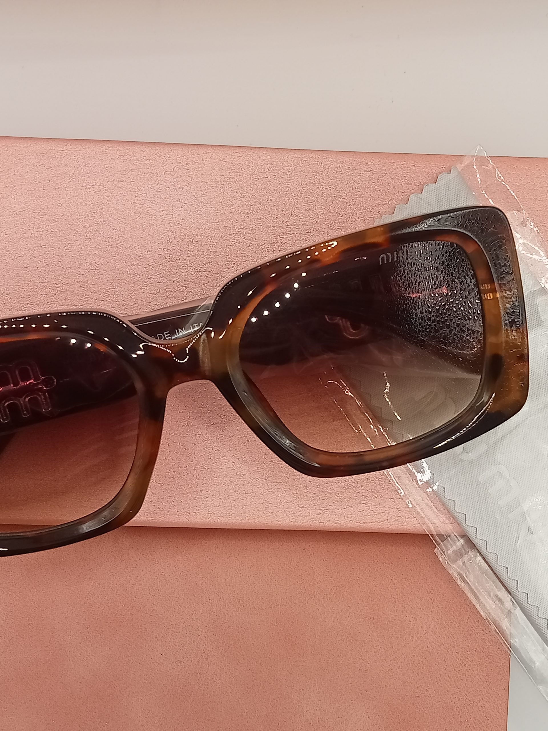 Detalles de Marca: El icónico logotipo de Miu Miu adorna las patillas.