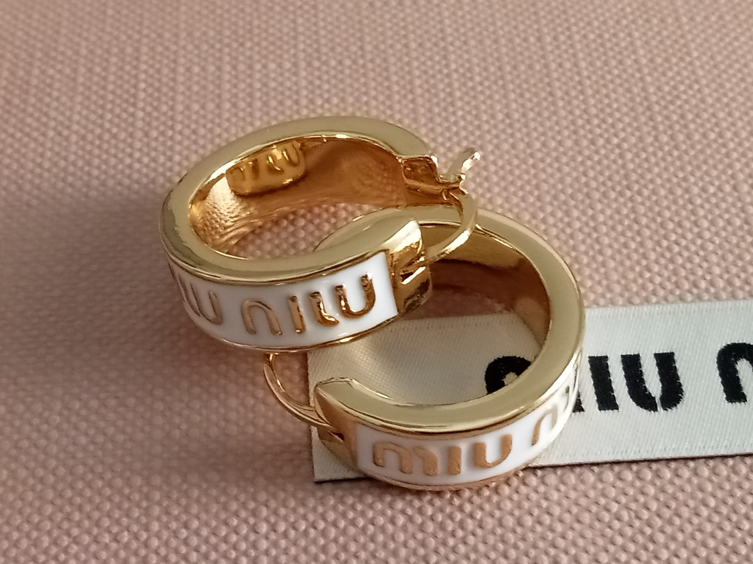 Pendientes Aros blanco y dorados con las iniciales Miu .