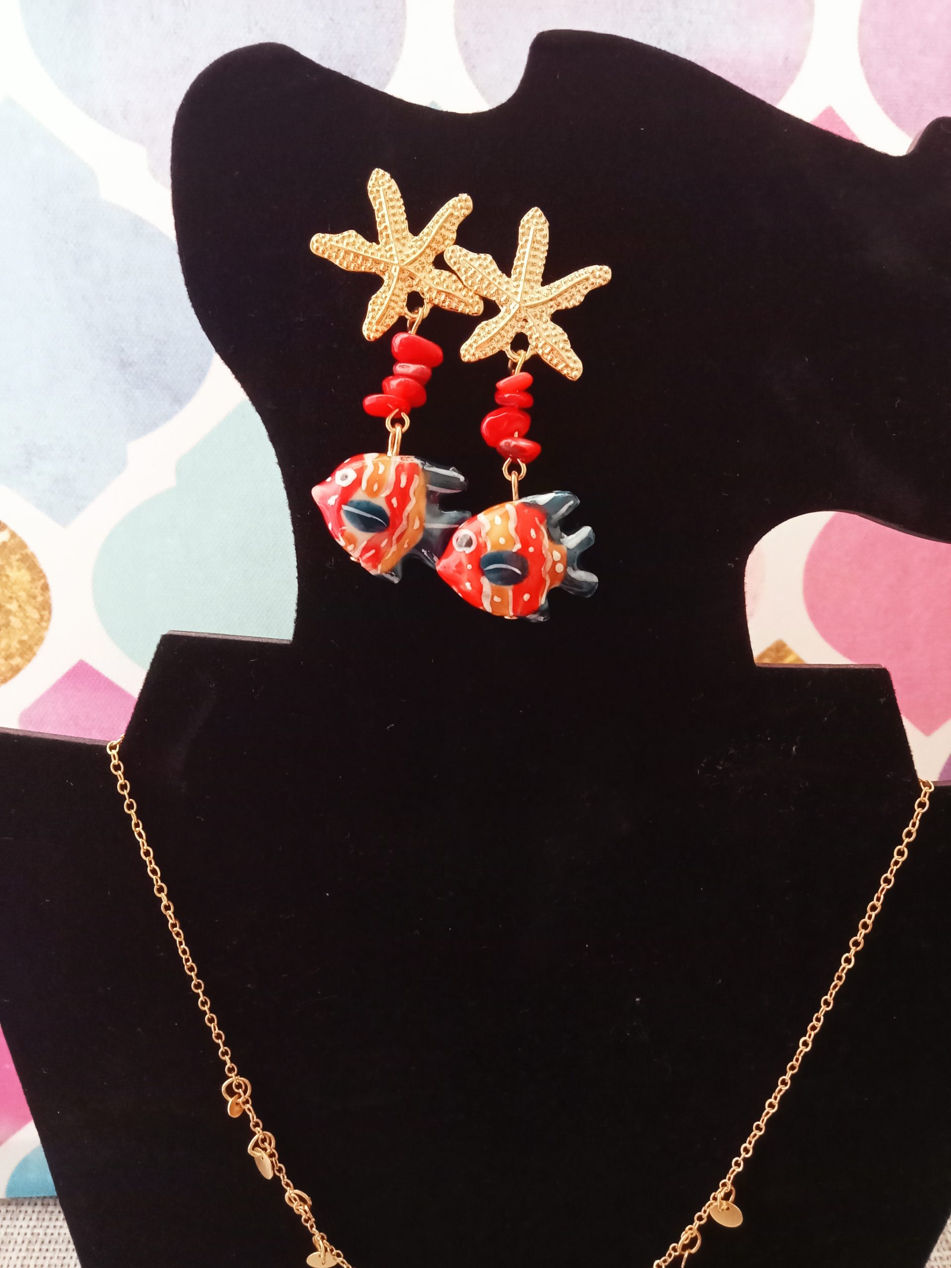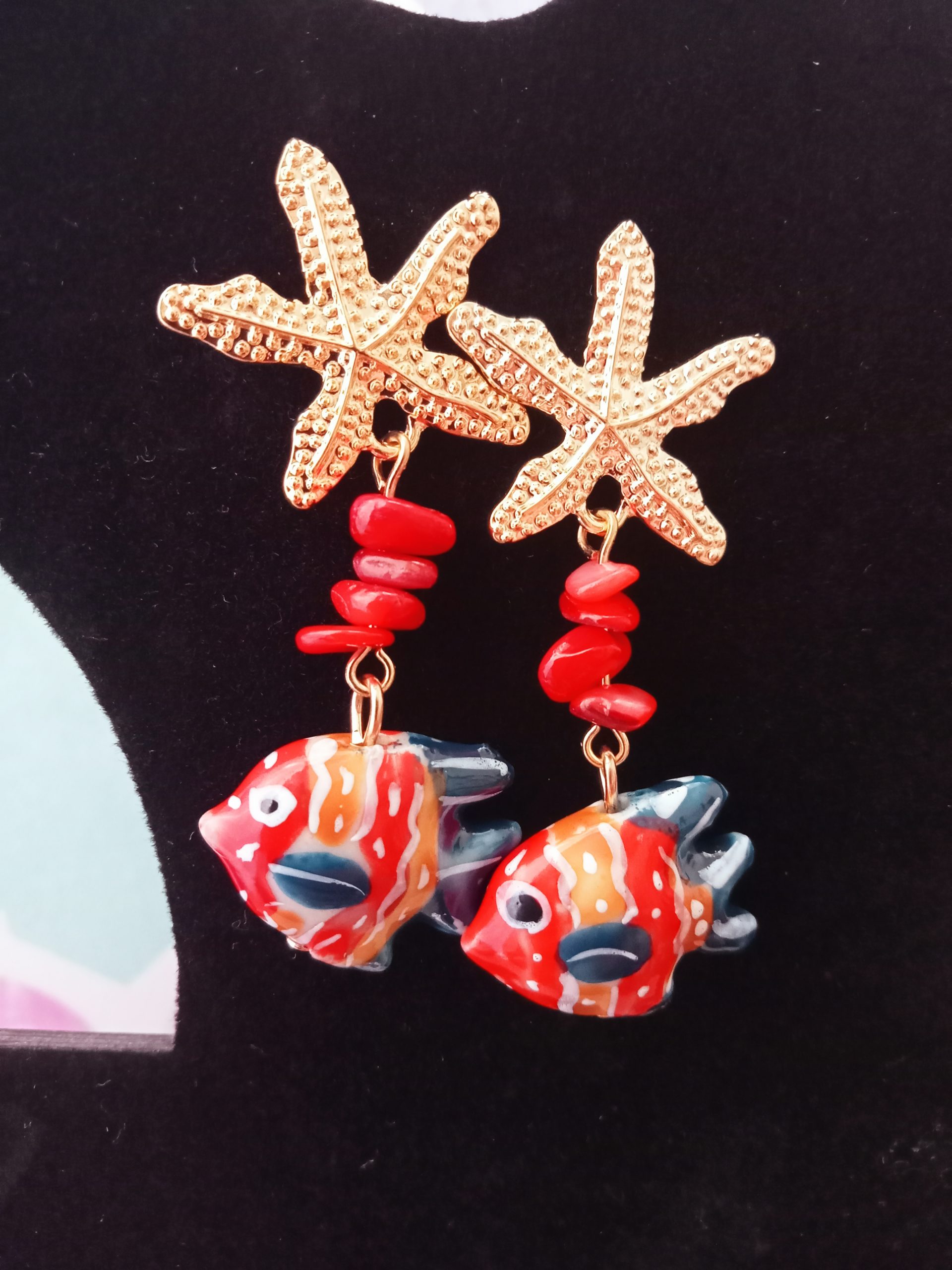 Elegantes pendientes con estrella de mar y pez de varios colores.