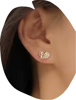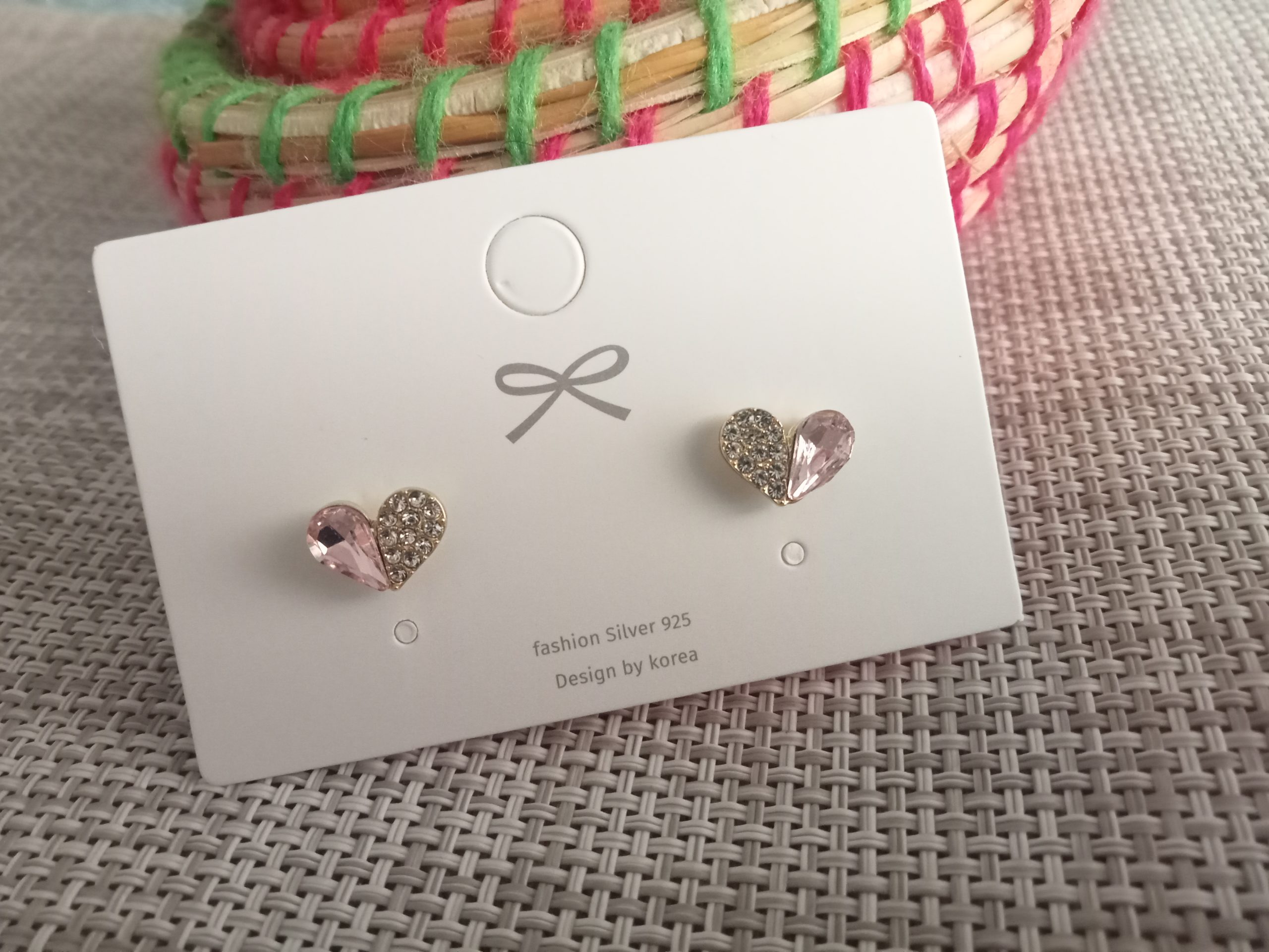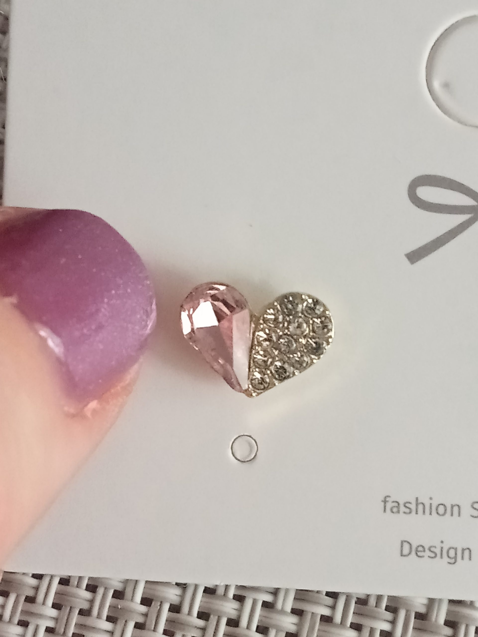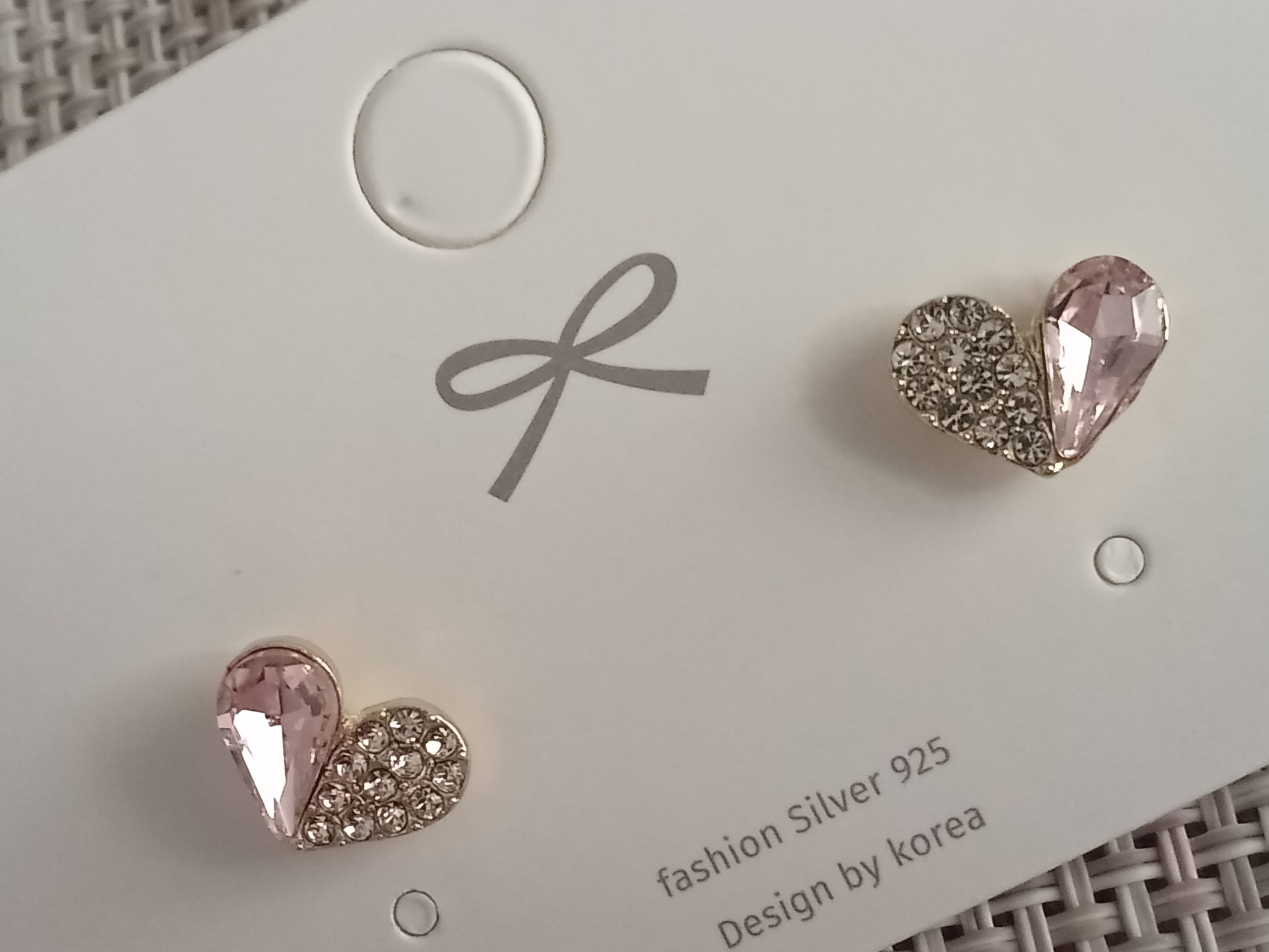 Elegantes pendientes corazon dividido en lacado rosa y brillos .