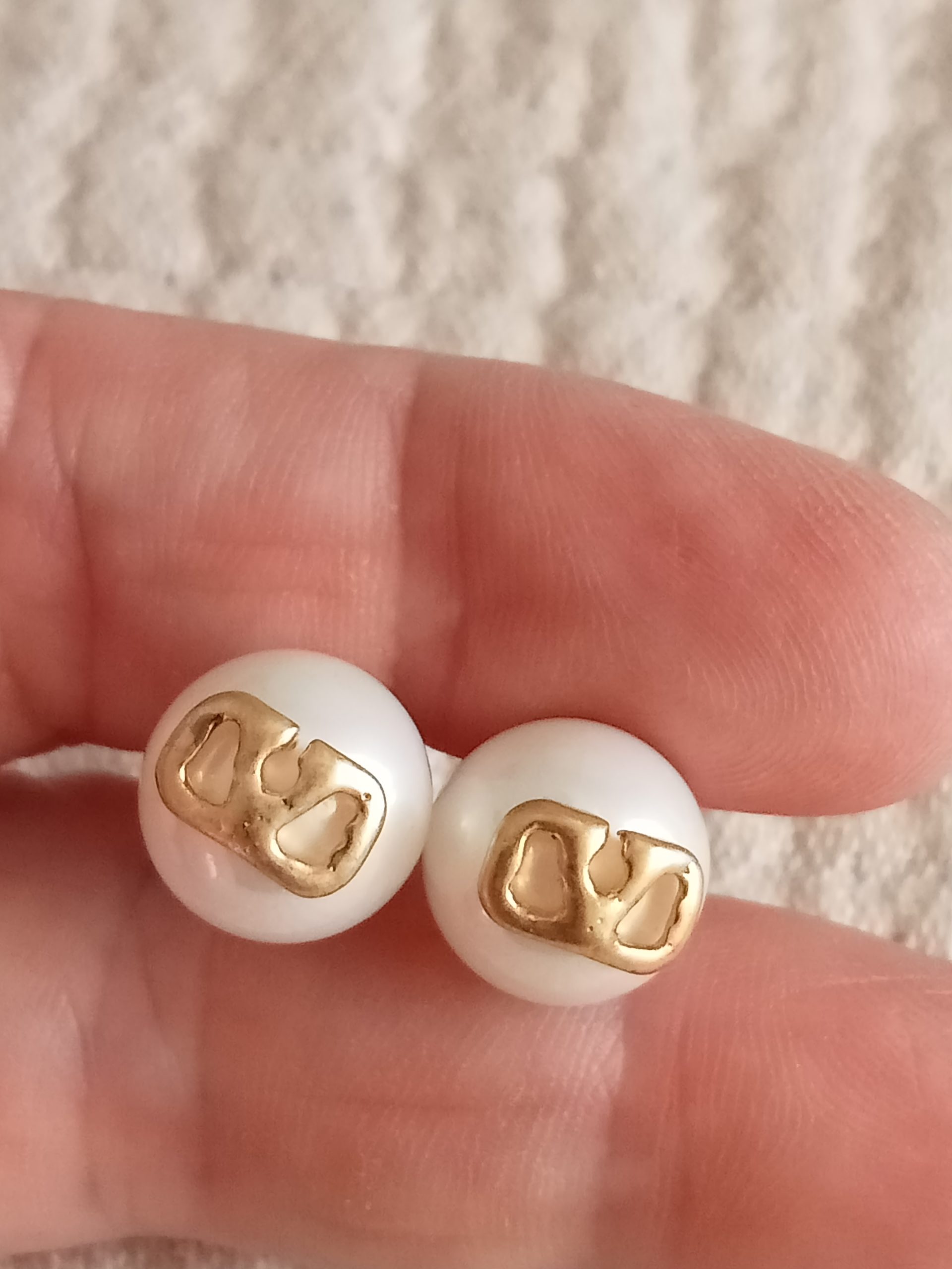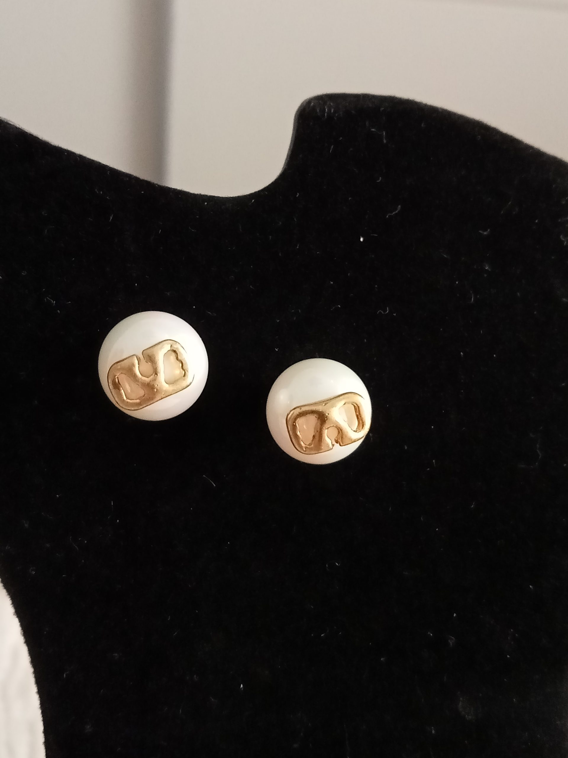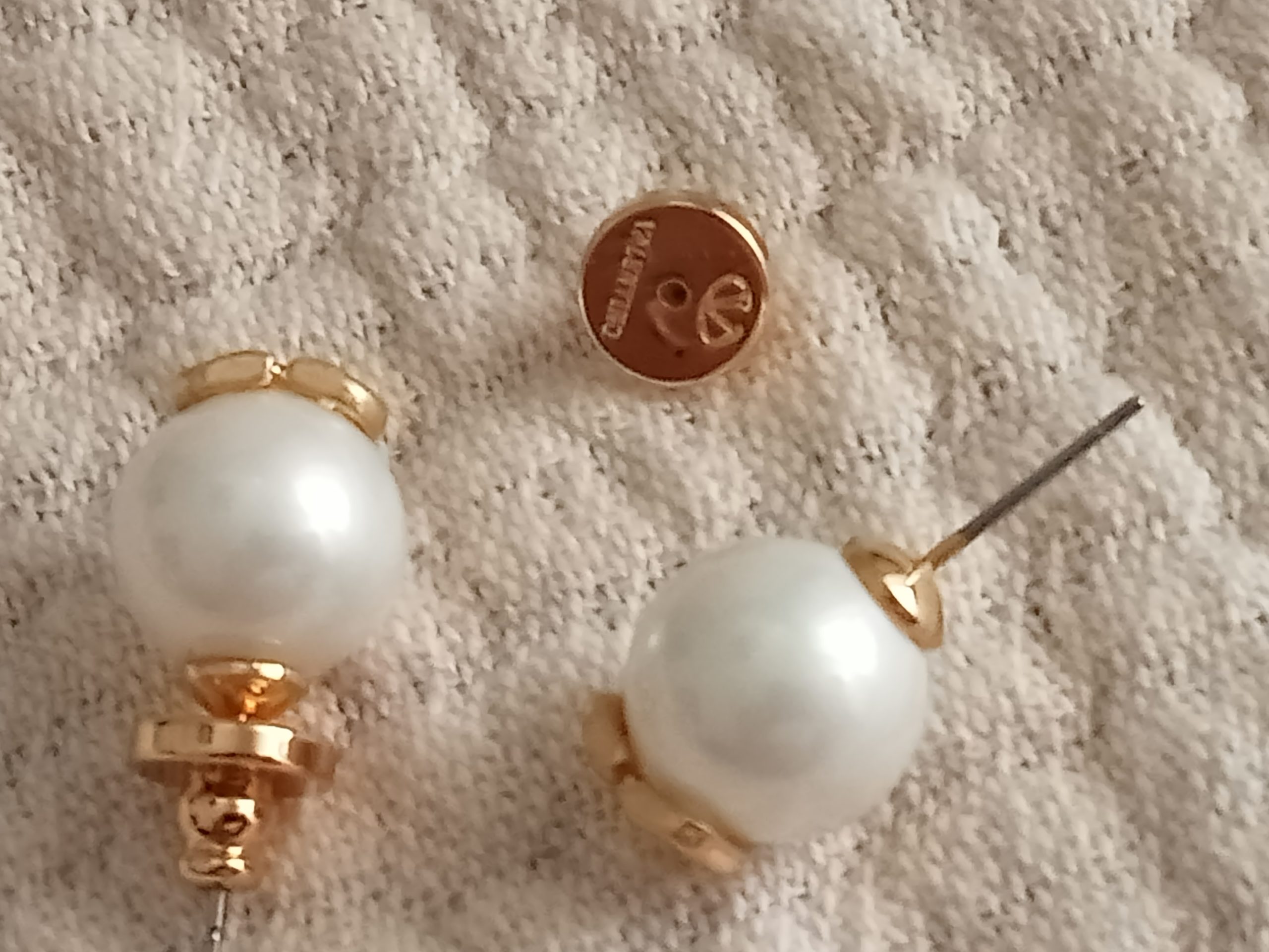 Pendientes elegantes con diseño dorado y perlas en tono blanco con detalle dorado decorativo.