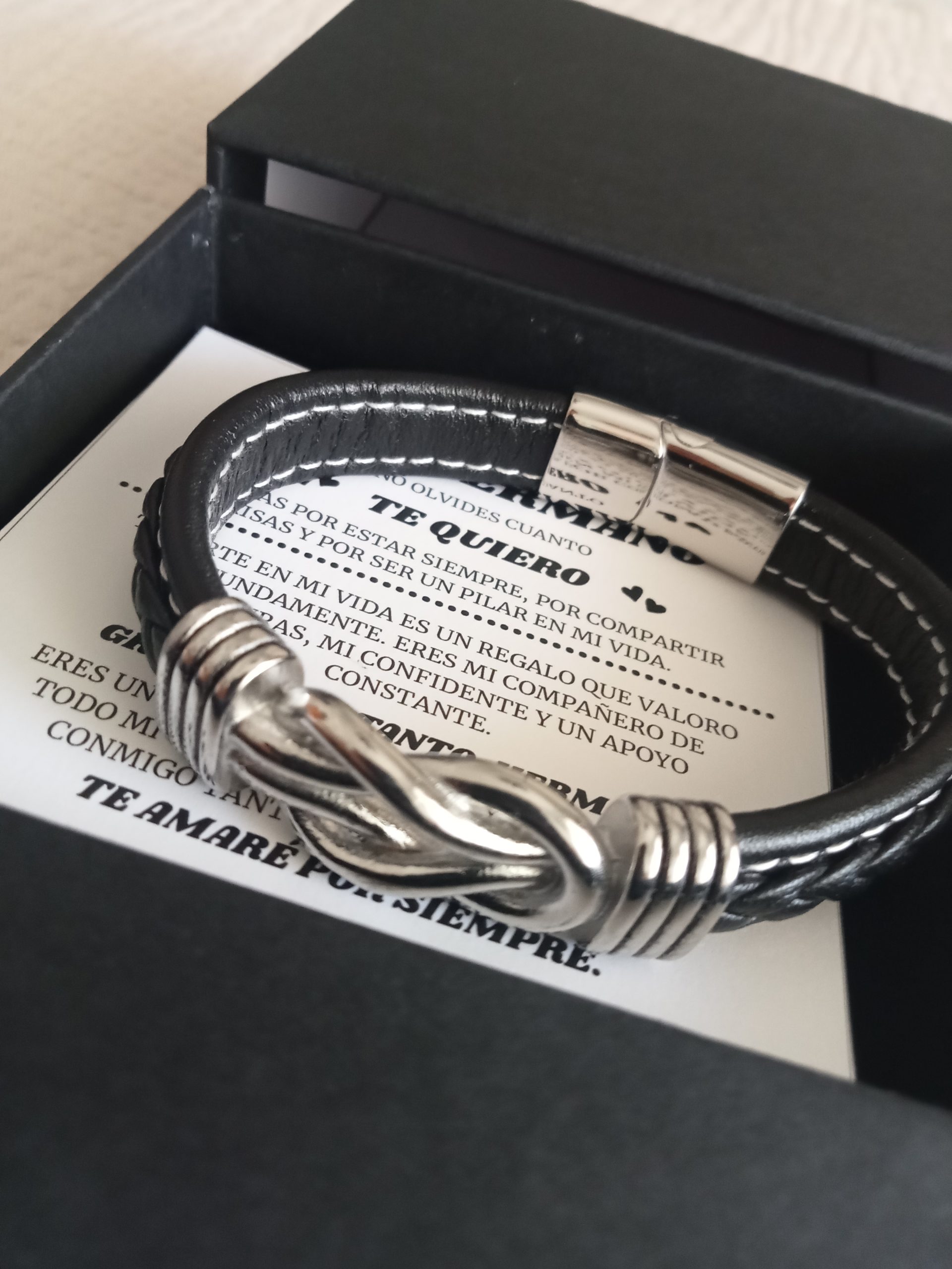 Pulsera masculina de diseño elegante y significativo, elaborada en cuero negro trenzado y liso con cierre metálico imantado de alta resistencia.
