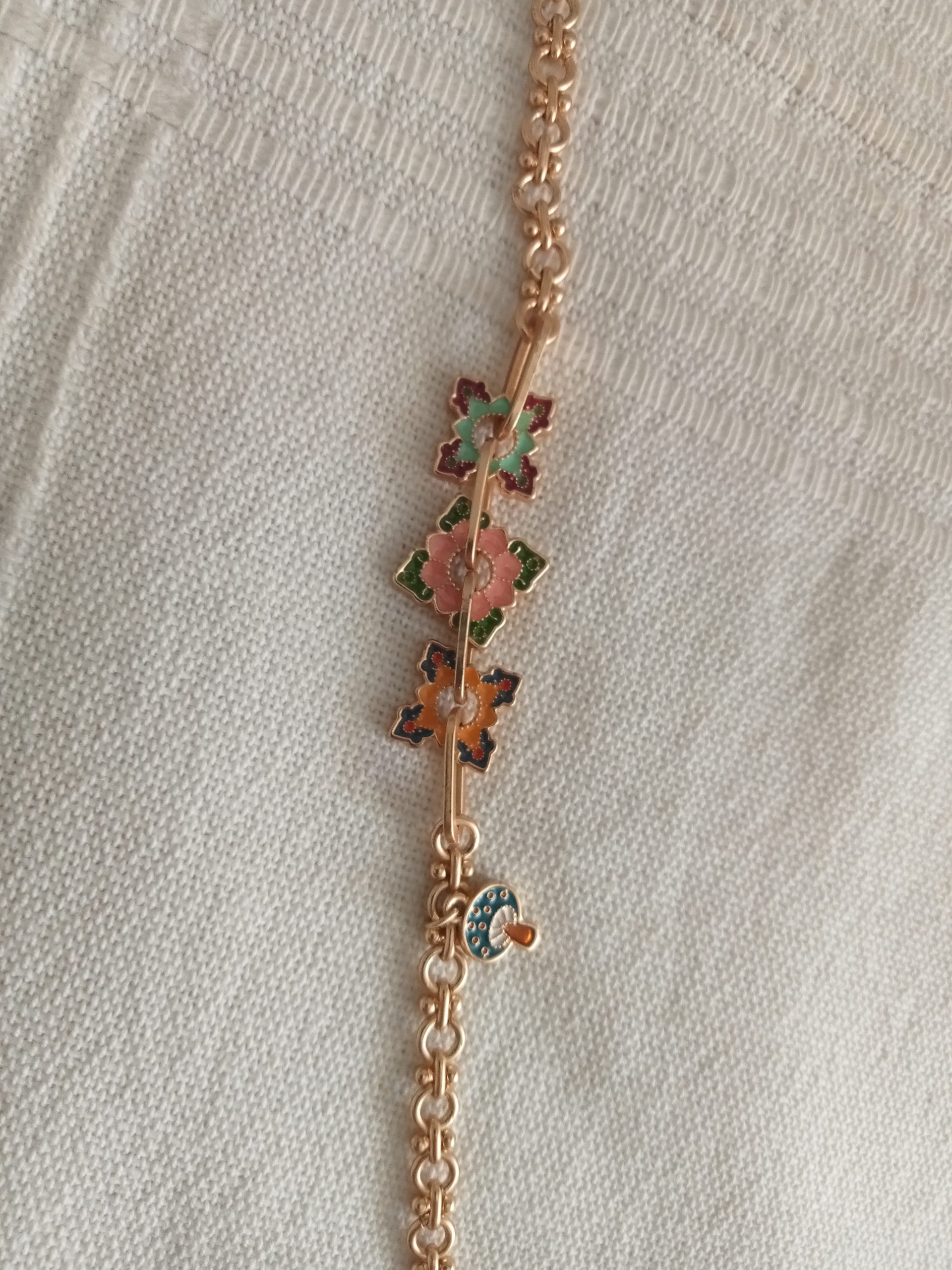 Pulsera única y llena de estilo, con eslabones dorados y charms decorados con esmalte en tonos vibrantes (rojo, turquesa, verde, rosa y coral). Cada detalle está cuidadosamente trabajado, combinando figuras geométricas y florales con pequeñas cuentas de colores que aportan un toque divertido y elegante.