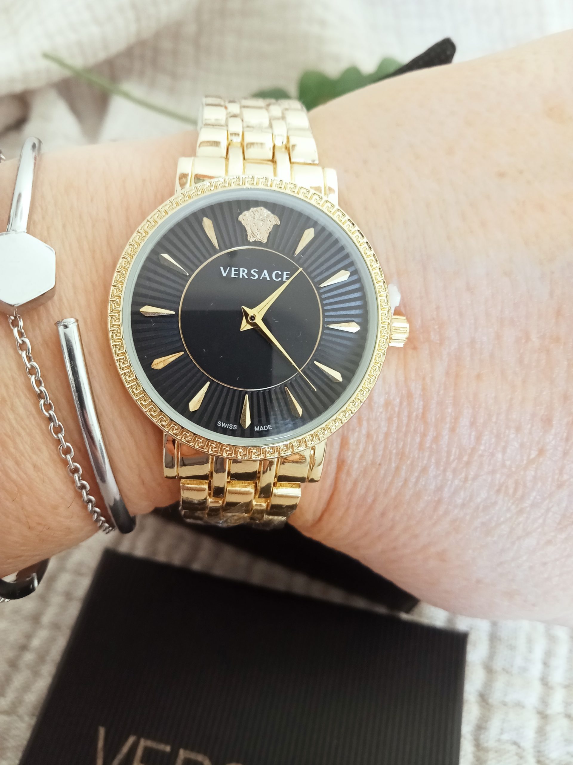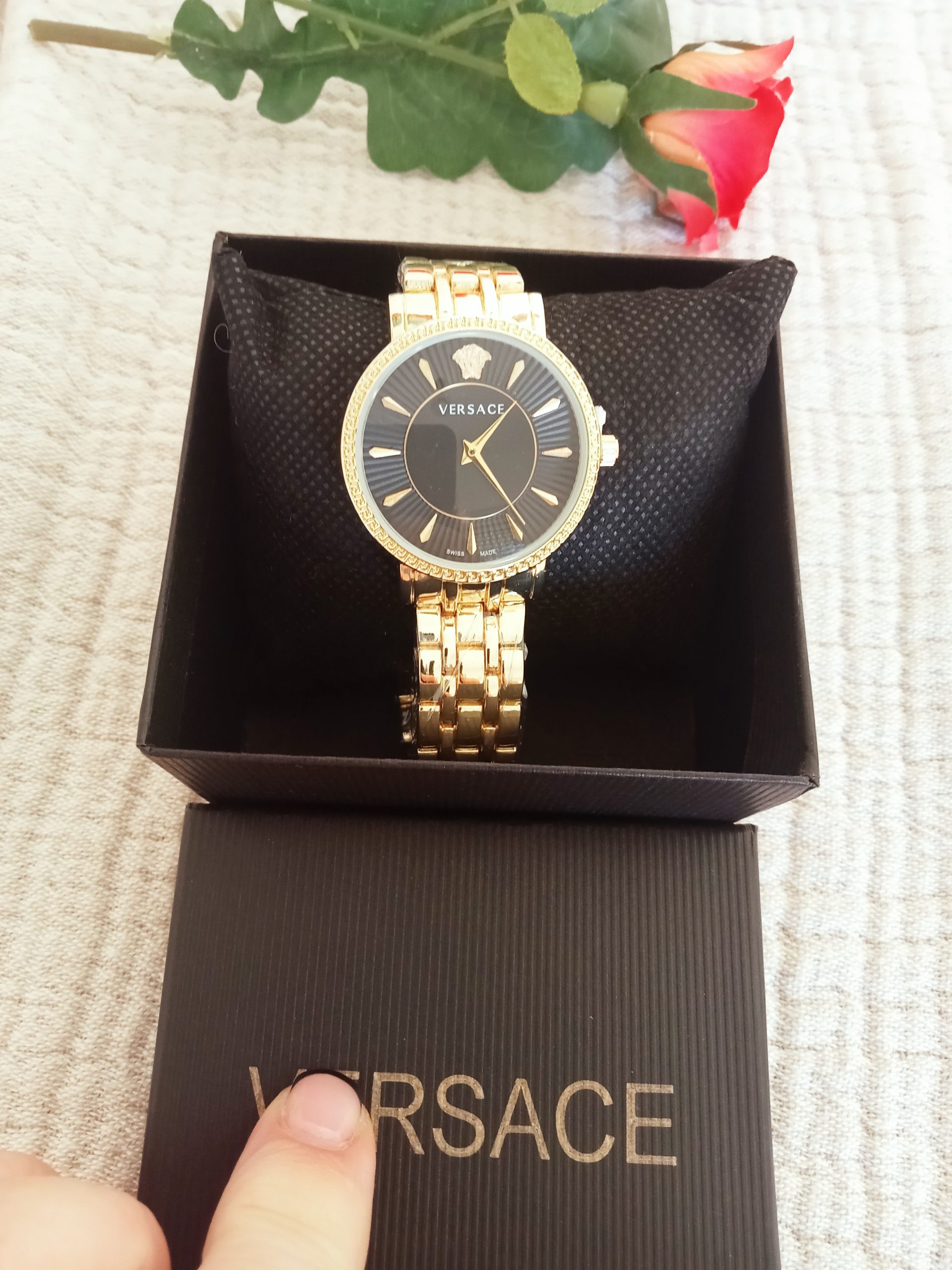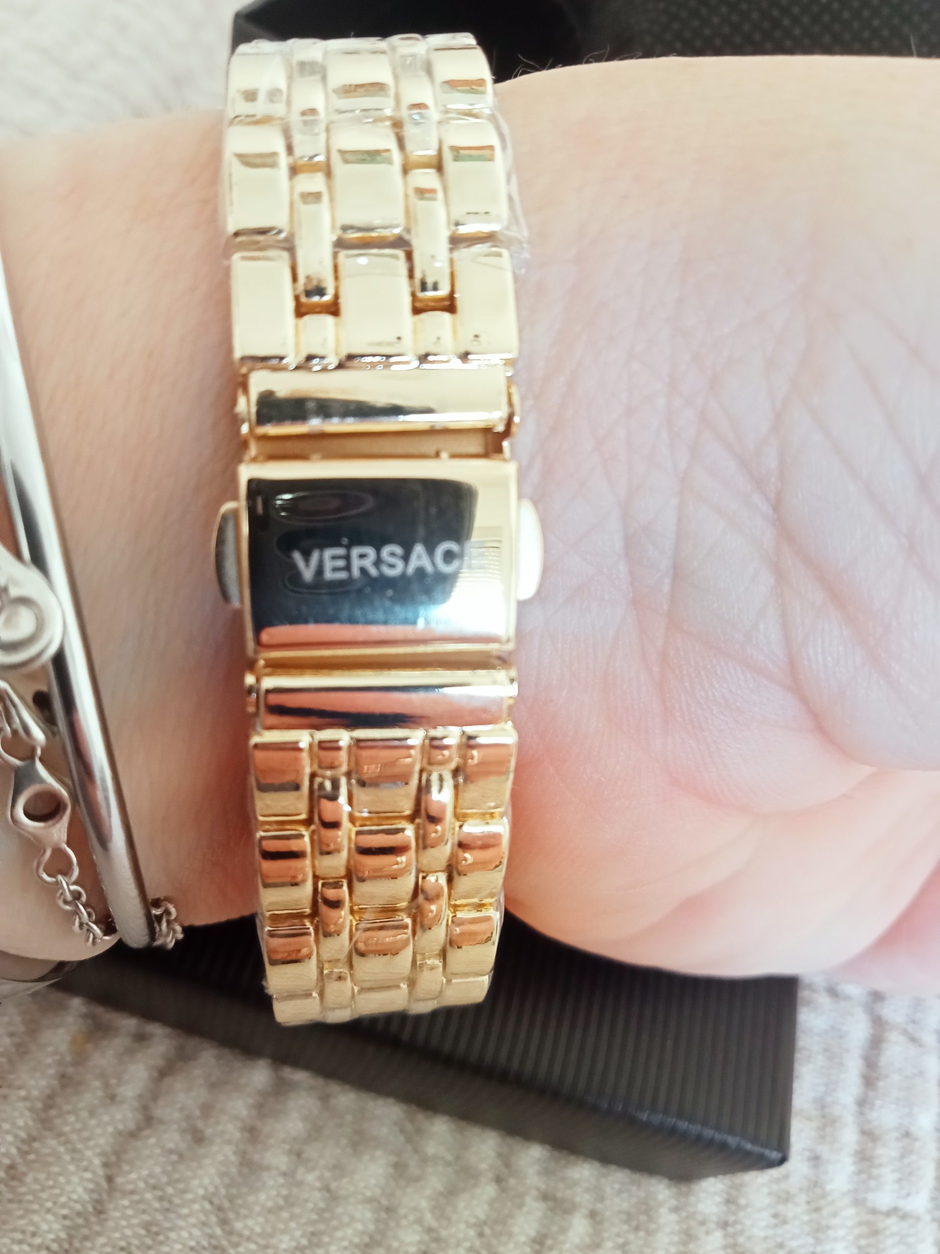 En dorado de acero inoxidable. Con inscripcion de la marca y caja .